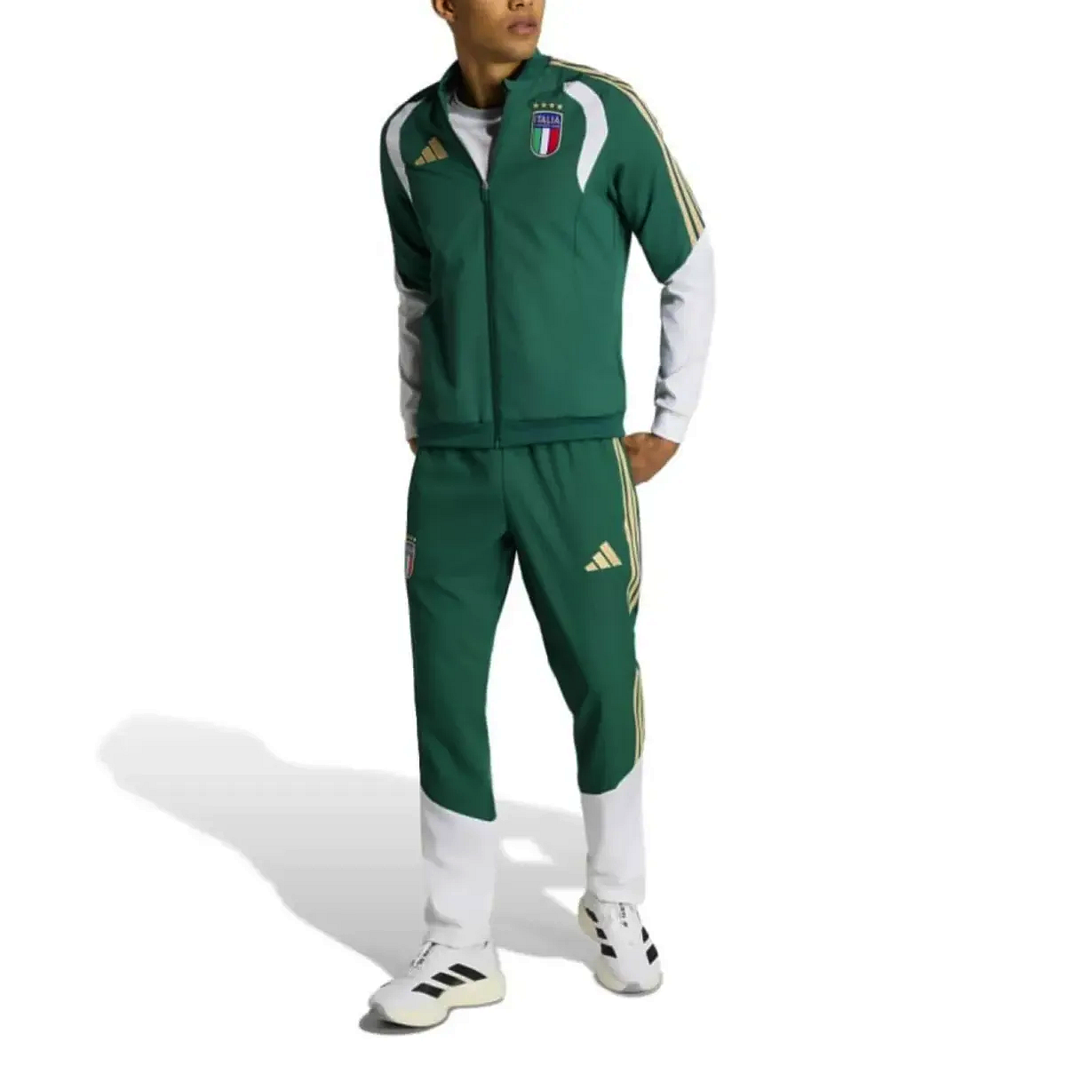 Adidas Italy green presentation tracksuit 2026 with gold stripes and Italy logo for soccer enthusiasts