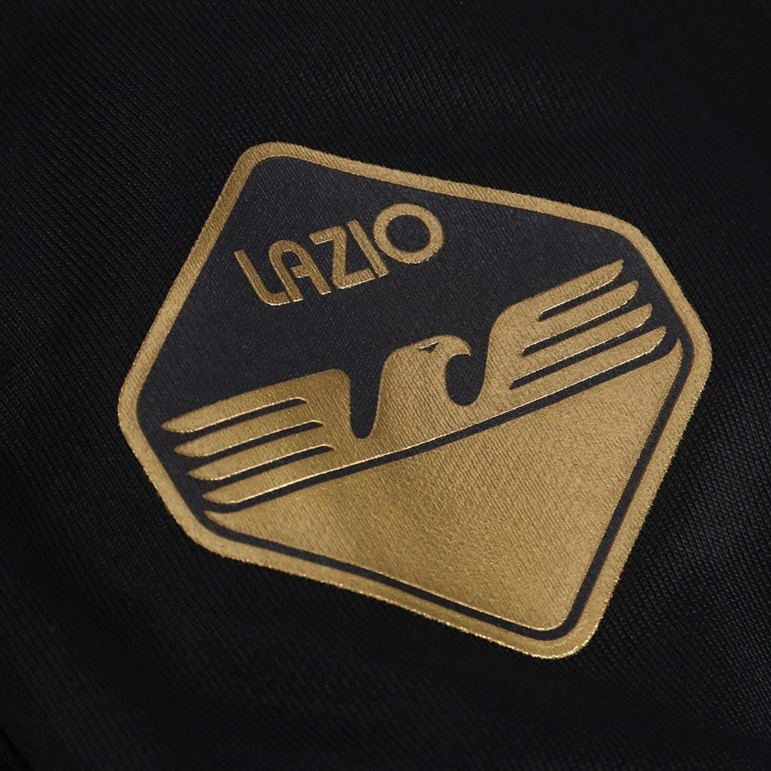 Zeigen Sie Ihre Unterstützung für die Adler von Rom ! SS Lazio Freizeit-Präsentations-Trainingsanzug für Fans, schwarze Version, für die Fußballsaison 2023/2024 in der Serie A. Dieser elegante Baumwoll-Trainingsanzug wurde vom japanischen technischen Sponsor Mizuno für die italienischen Biancocelesti entworfen und besteht aus einer schwarzen Trainingsjacke mit durchgehendem Reißverschluss und einer dazu passenden Hose, beide mit Sponsorenlogo und dem kultigen, goldfarbenen SS Lazio-Wappen im Vintage-Look.