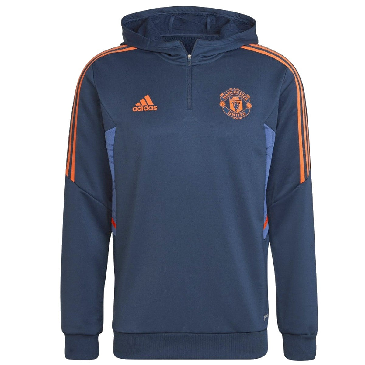 Adidas Manchester United hooded tracksuit in navy blue with orange stripes for fans and players