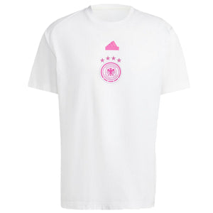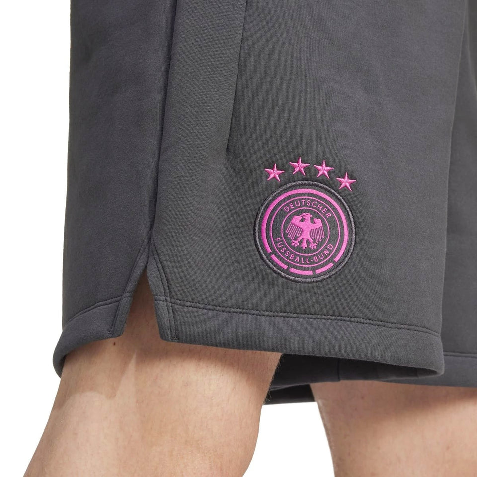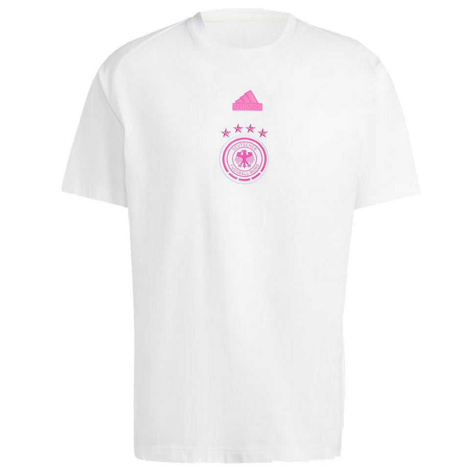 • Official DFB, german national soccer team, casual presentation set for upcoming 2024/2025 international season and UEFA Euro 2024. This style features white short sleeves jersey (100% cotton) and matching grey shorts (56% cotton, 40% polyester and 4% elastane) with fluo pink details. Designed by technical partner Adidas for Germany's players and staff, this set will be a good choice for your leisure time outdoor and indoor: show everyone your passion for Germany in total comfort!