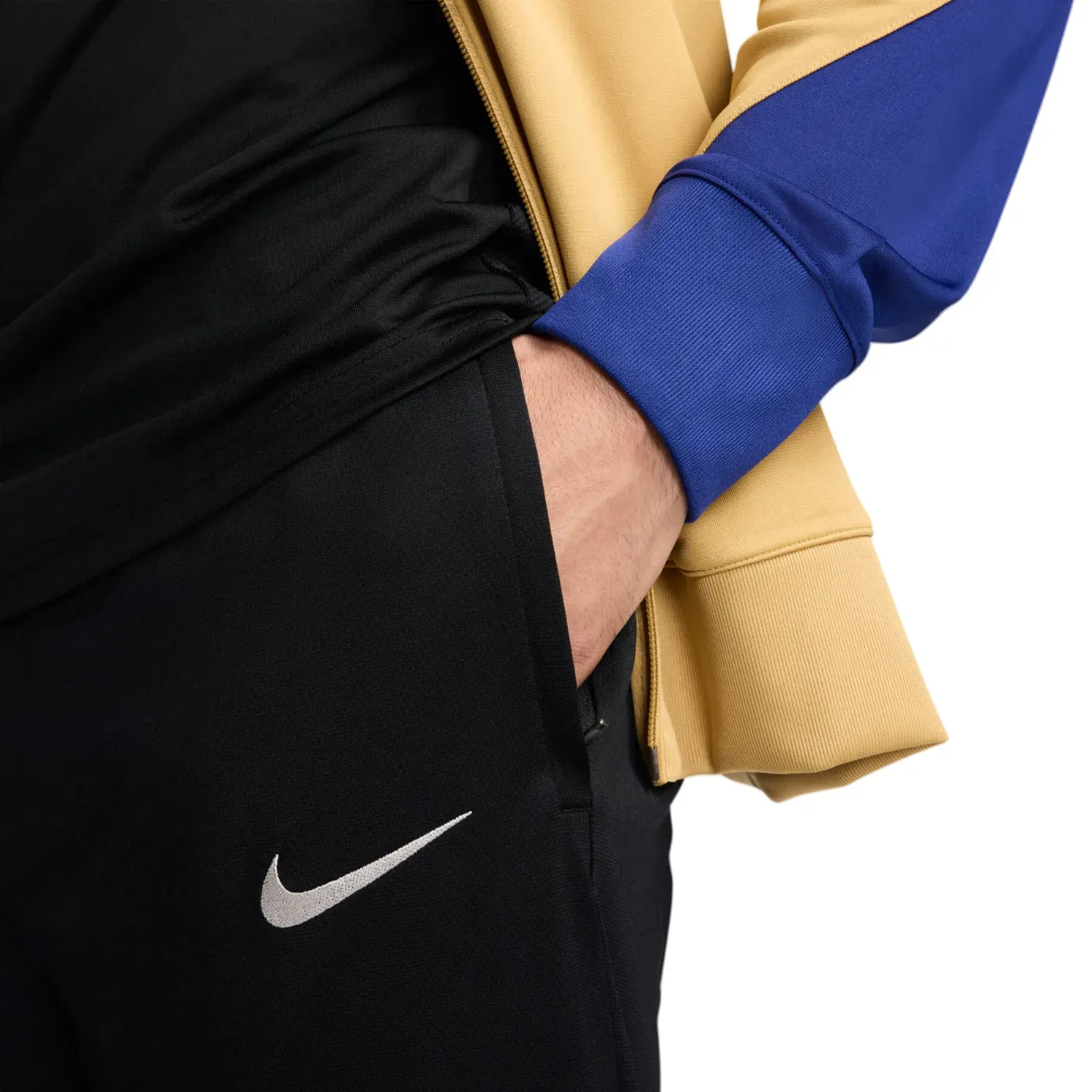 Official FC Barcelona training presentation tracksuit for 2024/2025 spanish soccer season, a must-have for fans! This set features a stunning gold jacket and matching black pants, adorned with the iconic FCB crest and Nike's swoosh: perfect outifit for showcasing your love for the catalan team.