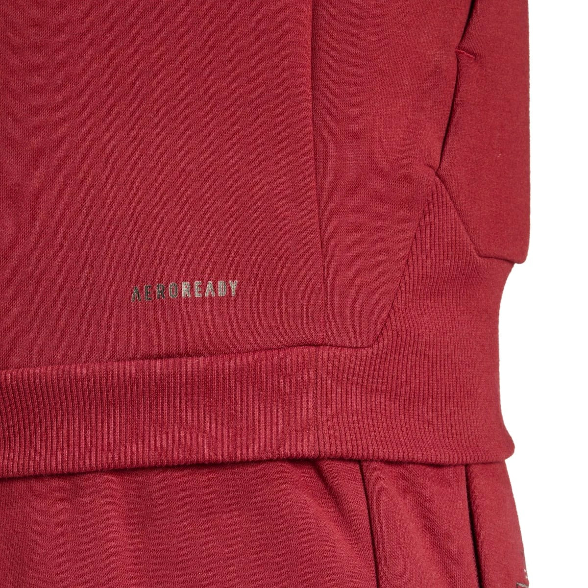 Close-up of red Adidas Belgium hooded tracksuit showing Aeroready fabric detail and ribbed cuffs