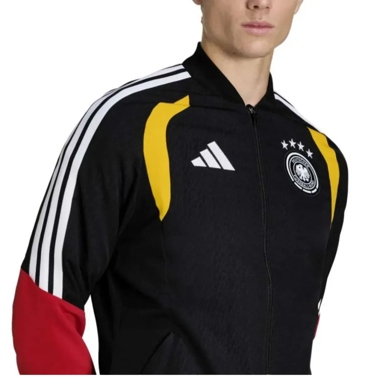 Authentic Adidas Germany black presentation tracksuit 2026, crafted for DFB with comfort and style in mind. The black full zip jacket and matching pants showcase yellow and red accents, inspired in the german flag. Whether you're a devoted fan or serious athlete, this authentic 2026/27 collection lets you embody the pride and prestige of german football. Pull on the same training gear trusted by Deutschland players and feel the connection to Germany!