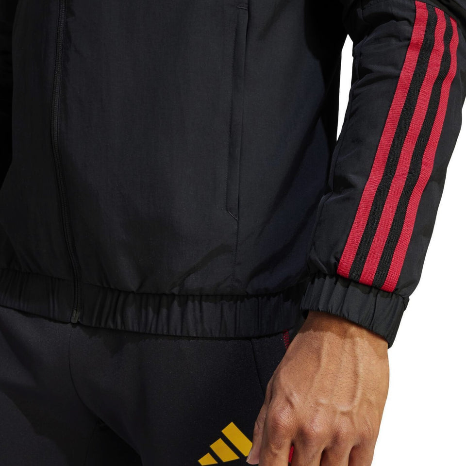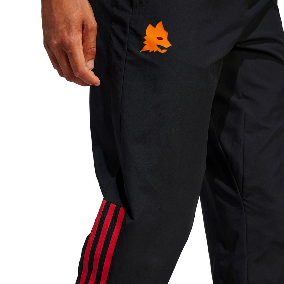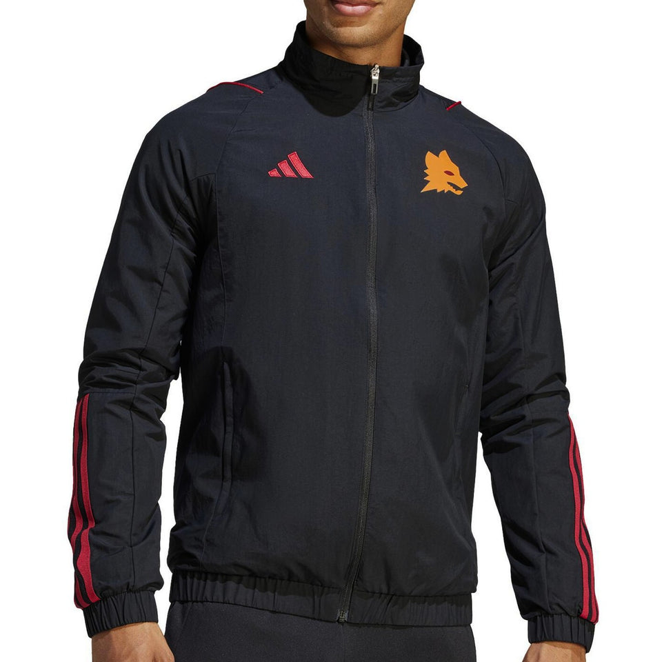 • New season, new technical sponsor, new training and presentation wear for ASR. On Soccertracksuits.com you can buy the official 2023/24 AS Roma presentation tracksuit for the upcoming national and international soccer season, in Serie A and UEFA Europa League. Designed by sportswear giant Adidas for the roman stars, this elegant set features black woven jacket and matching pants, both with red stripes and the iconic AS Roma wolf badge. Comfort and style for all soccer lovers' leisure time: wear with pride and show your support for the Giallorossi!