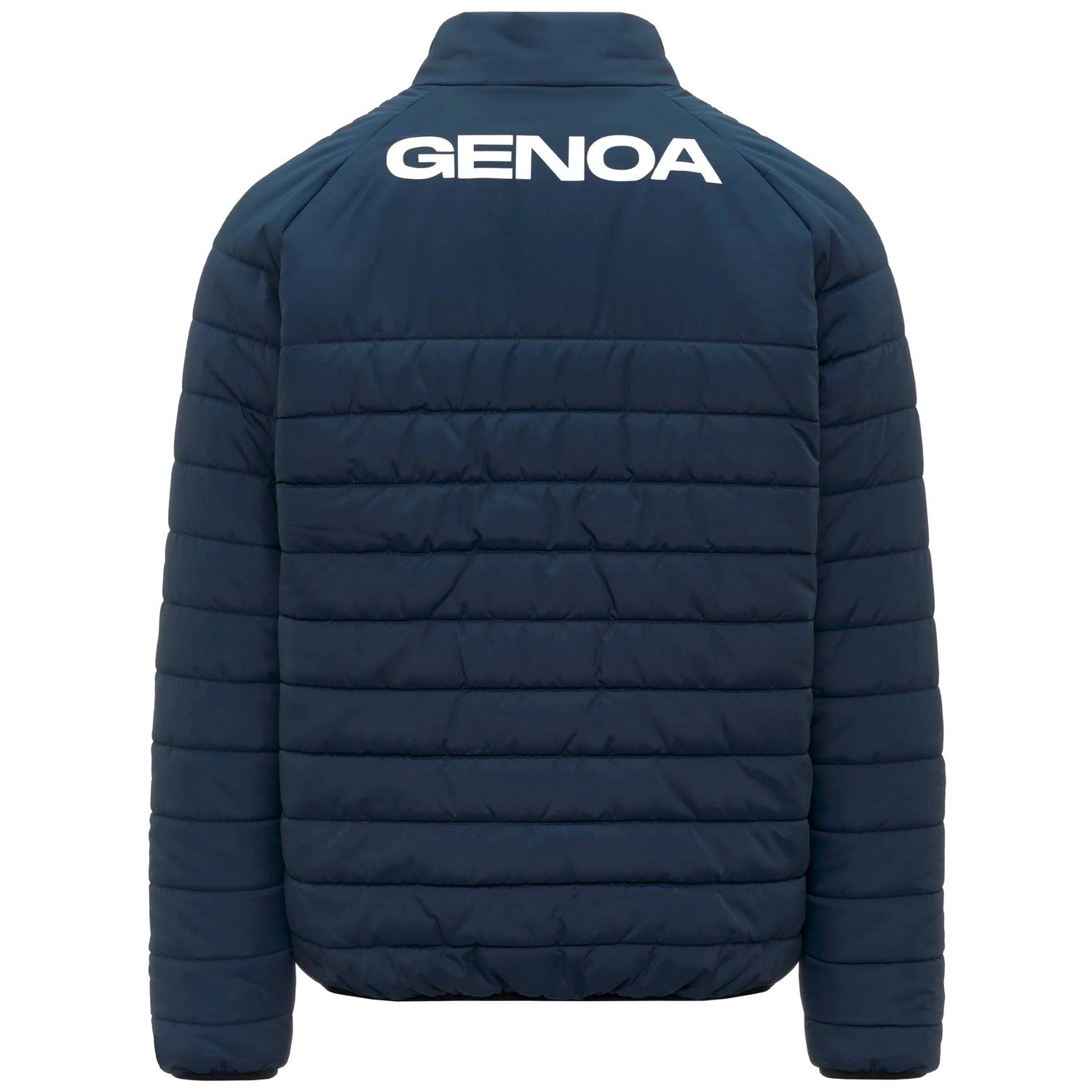 Elegant navy blue jacket with red details, made by technical sponsor Kappa for 25/26 italian soccer season in Serie A. Buy it now, show your support for the italian Grifone with this padded Genoa CFC bomber jacket 2025, water resistant fabric, perfect for the coldest part of the year!