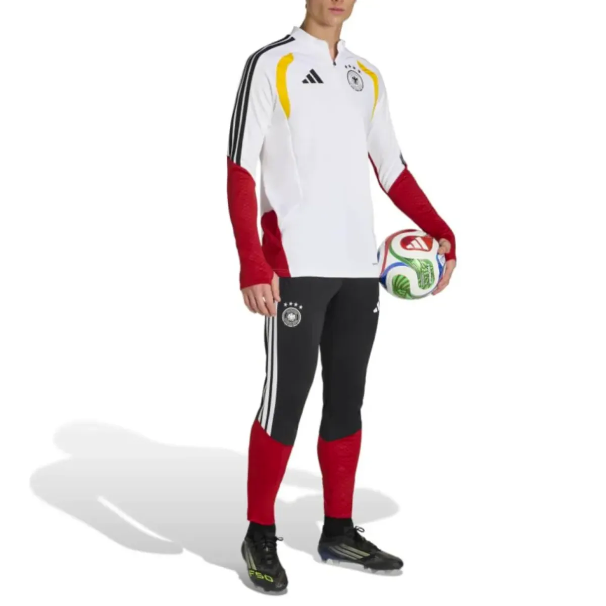 Train like german players in this official Adidas Germany tracksuit, crafted for the DFB with unmistakable style. The white/red 1/4 zip top and coordinating black/red pants showcase the Adidas logo and the german federation emblem. This authentic 2026/27 collection lets you embody the pride and prestige of german football. Wear the colors of Deutschland with pride everywhere!