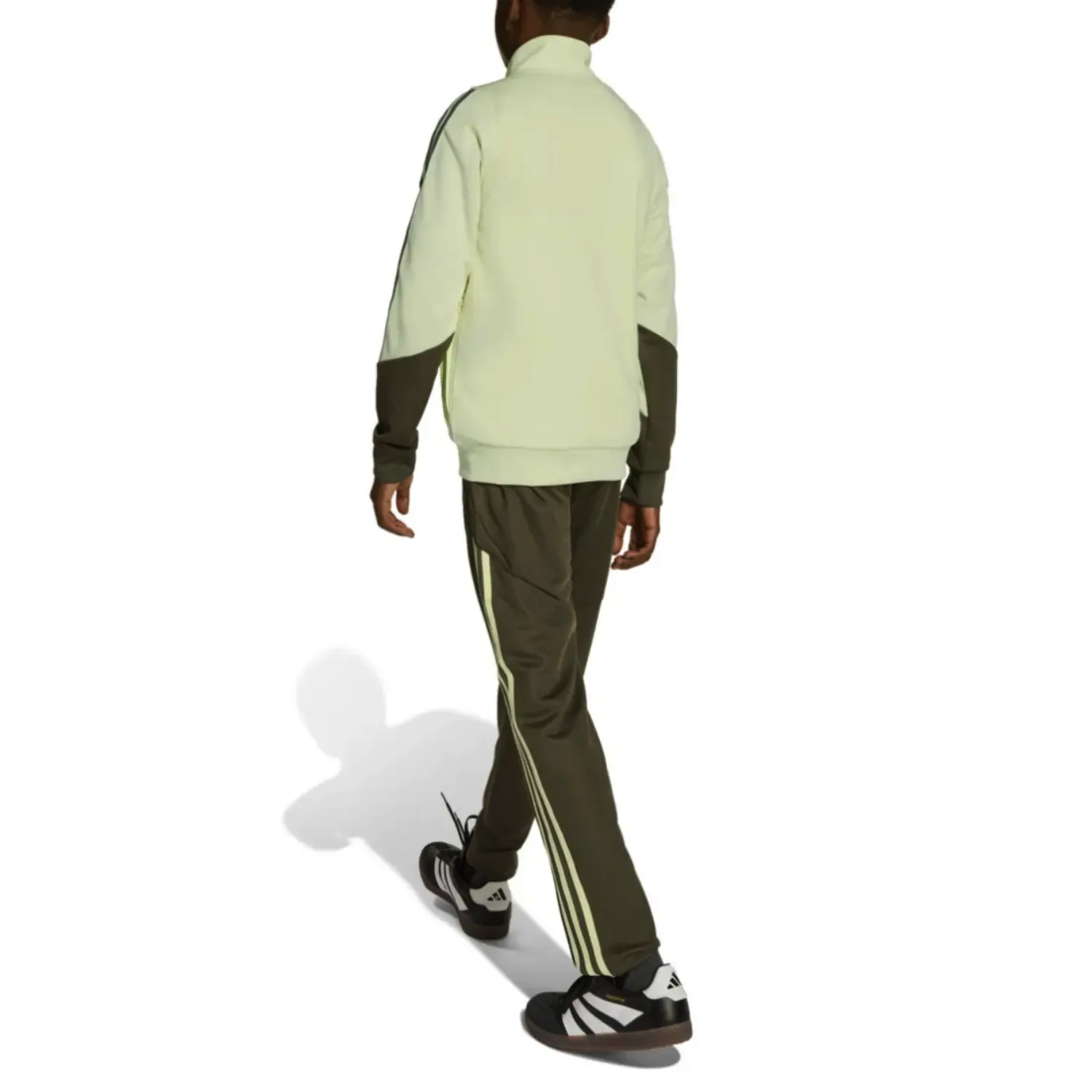 This stylish version features lime yellow green and matching pants, plus the iconic crest of Real Madrid and the Adidas logo. Beautiful bench version to be worn by players like Mbappé and Vinicius Jr before and during all their games in La Liga. Kids version (kids Real Madrid tracksuit 2025)