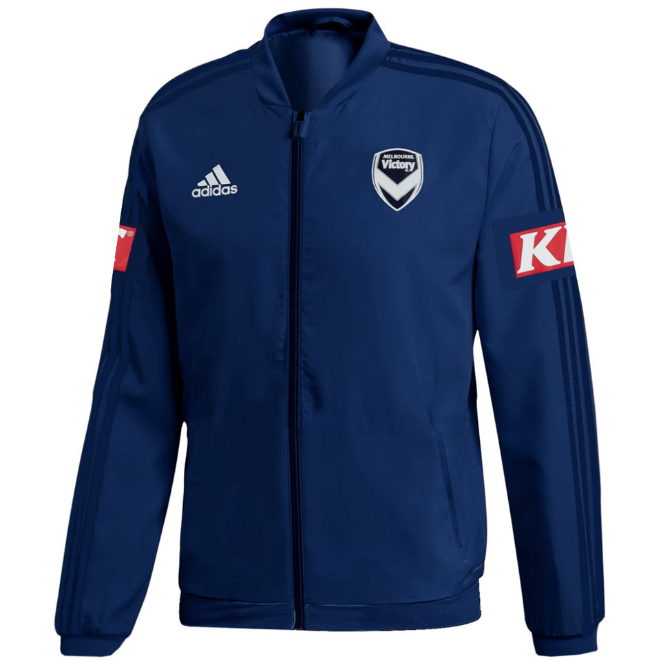 Melbourne Victory FC authentic 20/21 full zip training presentation tracksuit (navy sponsored jacket and matching pants) designed by Adidas for the club based in Melbourne, Australia. Same set as worn by players and staff before every game during australian soccer season 2020/2021 and it's perfect for your leisure time. Show everyone around you your passion for Australia, Melbourne Victory... and for soccer!
