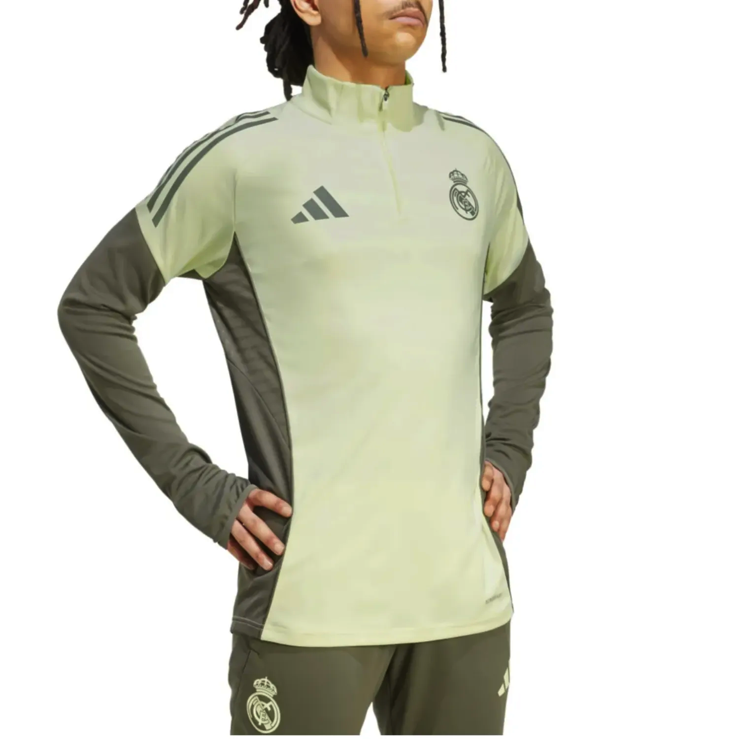 Official 2025/2026 Real Madrid CF training technical tracksuit. Designed by Adidas with both comfort and style in mind, this classy and modern looking set includes a lime yellow 1/4 zip training top and matching training pants, all adorned with the iconic Adidas stripes/logo and the club's crest.