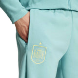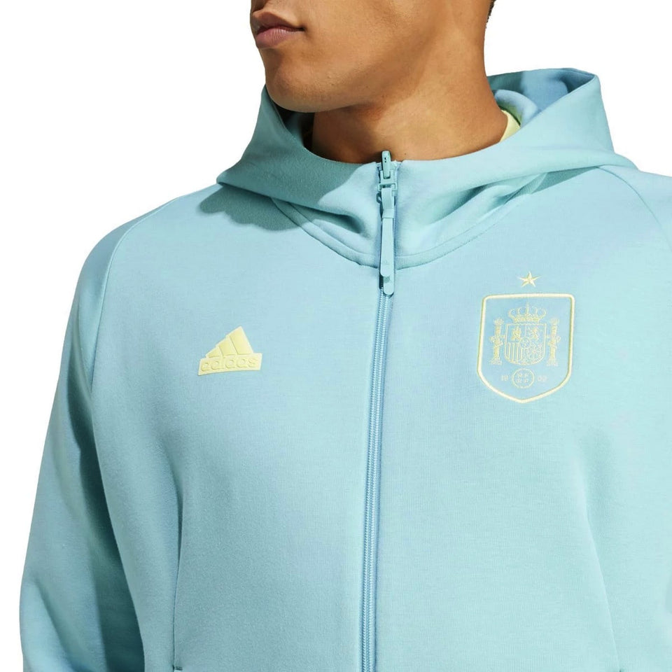 Spanish national soccer team, Casual Travel hooded presentation tracksuit for 2024/2025 international season. Designed by technical partner Adidas for the FEF stars, this authentic set is designed for both the 2024/25 season and the UEFA Euro 2024. Made of 56% cotton, 40% recycled polyester, and 4% elastane, this stunning tracksuit features a light water colored zip hoodie and matching pants. Perfect for leisure wear, it offers to players and fans a comfortable, soft, and cozy feel. Show your support for La Roja and the colors of Spain with pride - buy now and be a part of the team's journey!