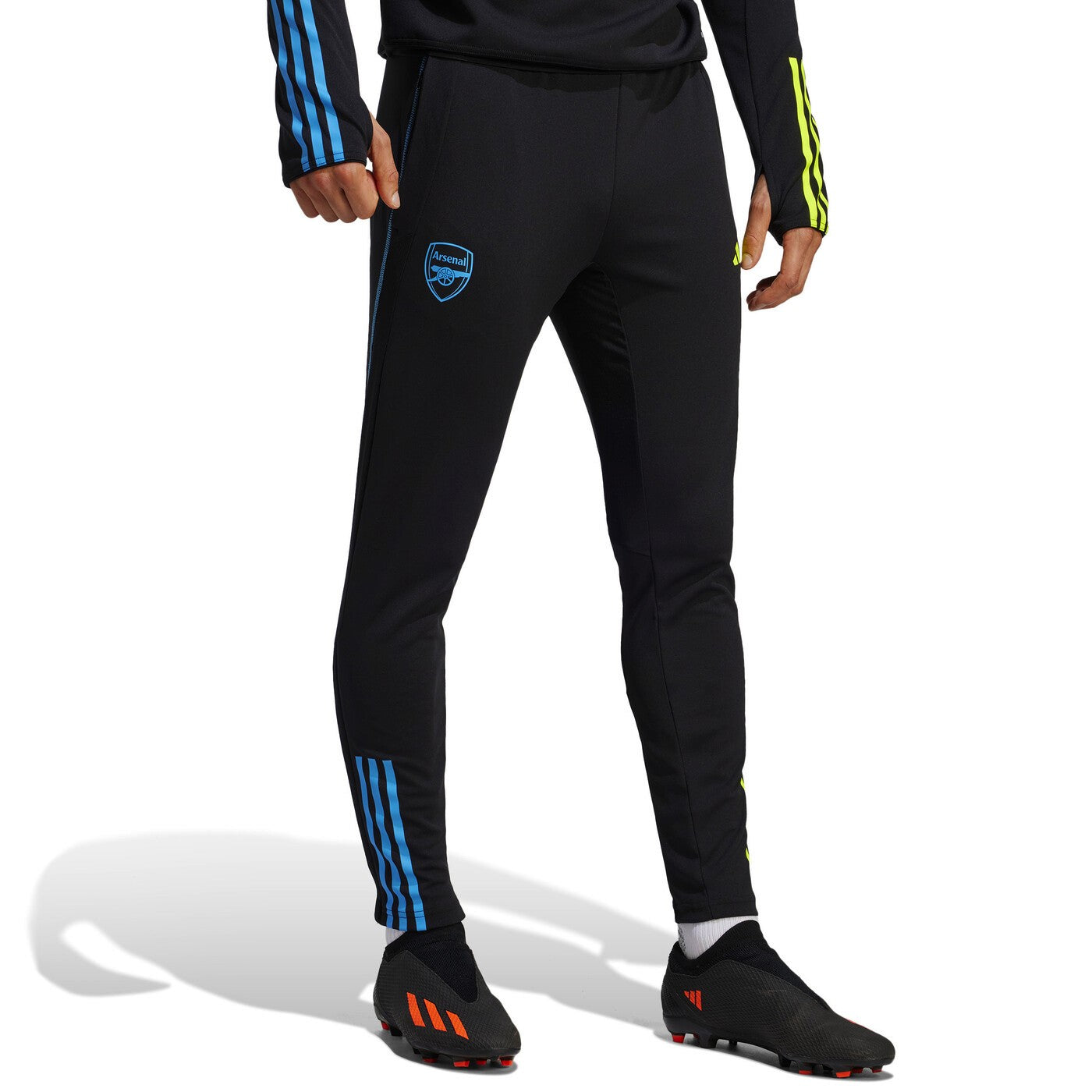 2023 24 Arsenal football tracksuit set in black with neon yellow and blue accents on SoccerTracksuits.com