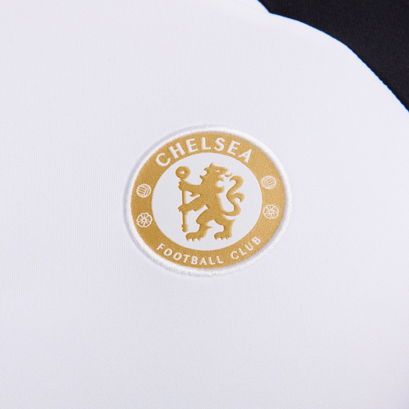 Chelsea FC technical training set for new 2023/2024 season in english Premier League. Designed by partner Nike for the Stamford Bridge stars, it features white/black lightweight training top and matching black training pants, both with gold crest and swoosh, with the combination of CFC and iconic Nike's swoosh.