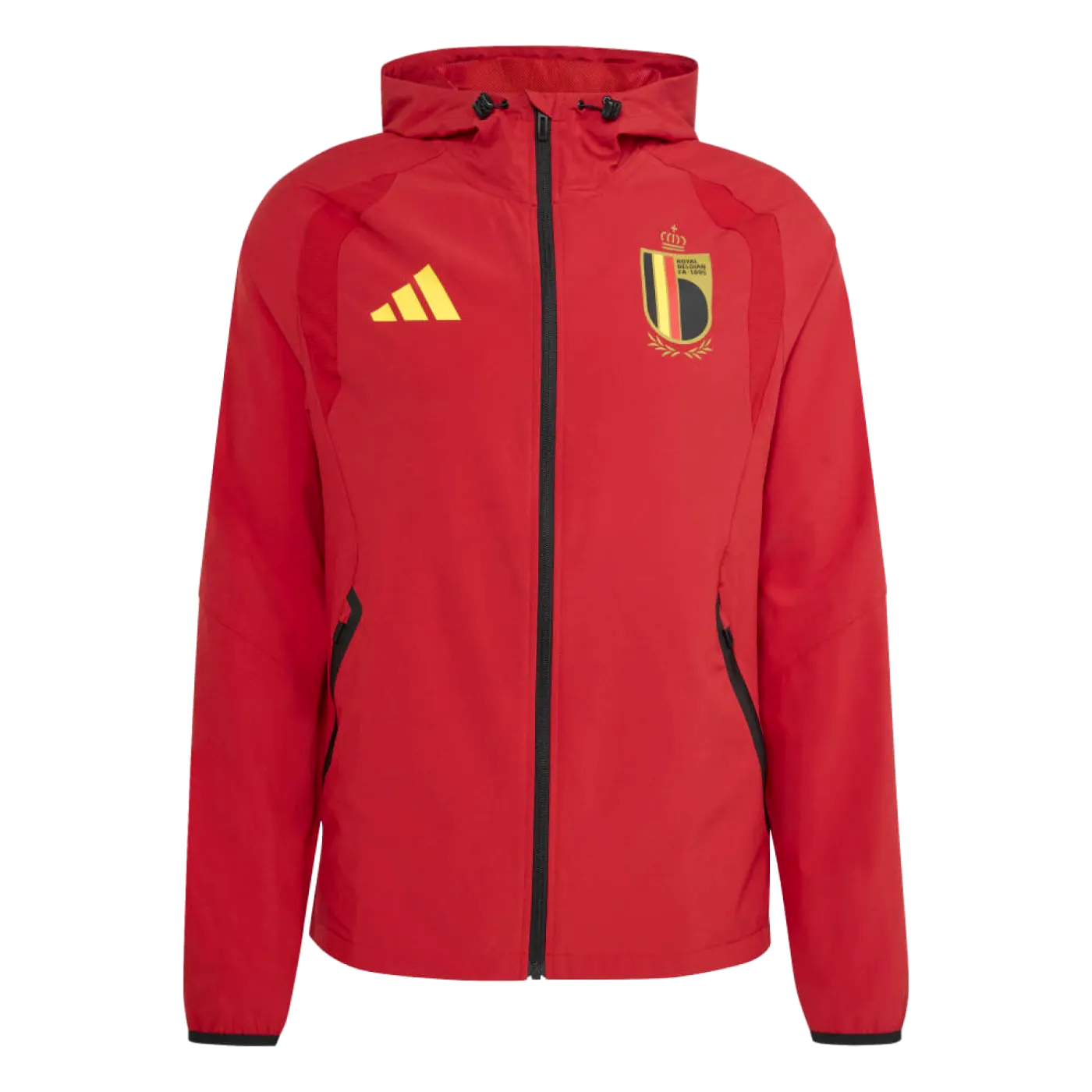 • Authentic belgian national soccer team Casual Travel hooded presentation tracksuit 2026/2027! Created by technical partner Adidas for Belgium, this set is designed for both the 2026/27 international season and the FIFA World Cup 2026. Made out of 86% polyester, and elastane, this woven tracksuit features a red full zip hoodie and matching black pants.