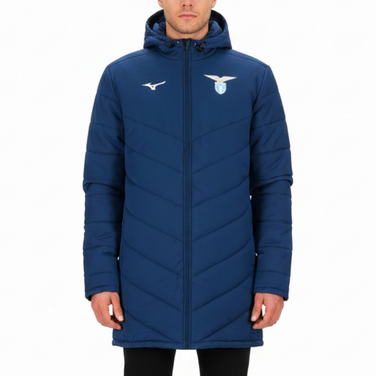 • SS Lazio authentic training presentation hooded bench coat, to be worn by players before and during italian Serie A games at the Stadio Olimpico in Rome. Amazing padded style crafted by technical sponsor Mizuno for 2023/2024 soccer season. Buy it now, show your support for the Biancocelesti with this design perfect for your coldest soccer days and winter leisure time!